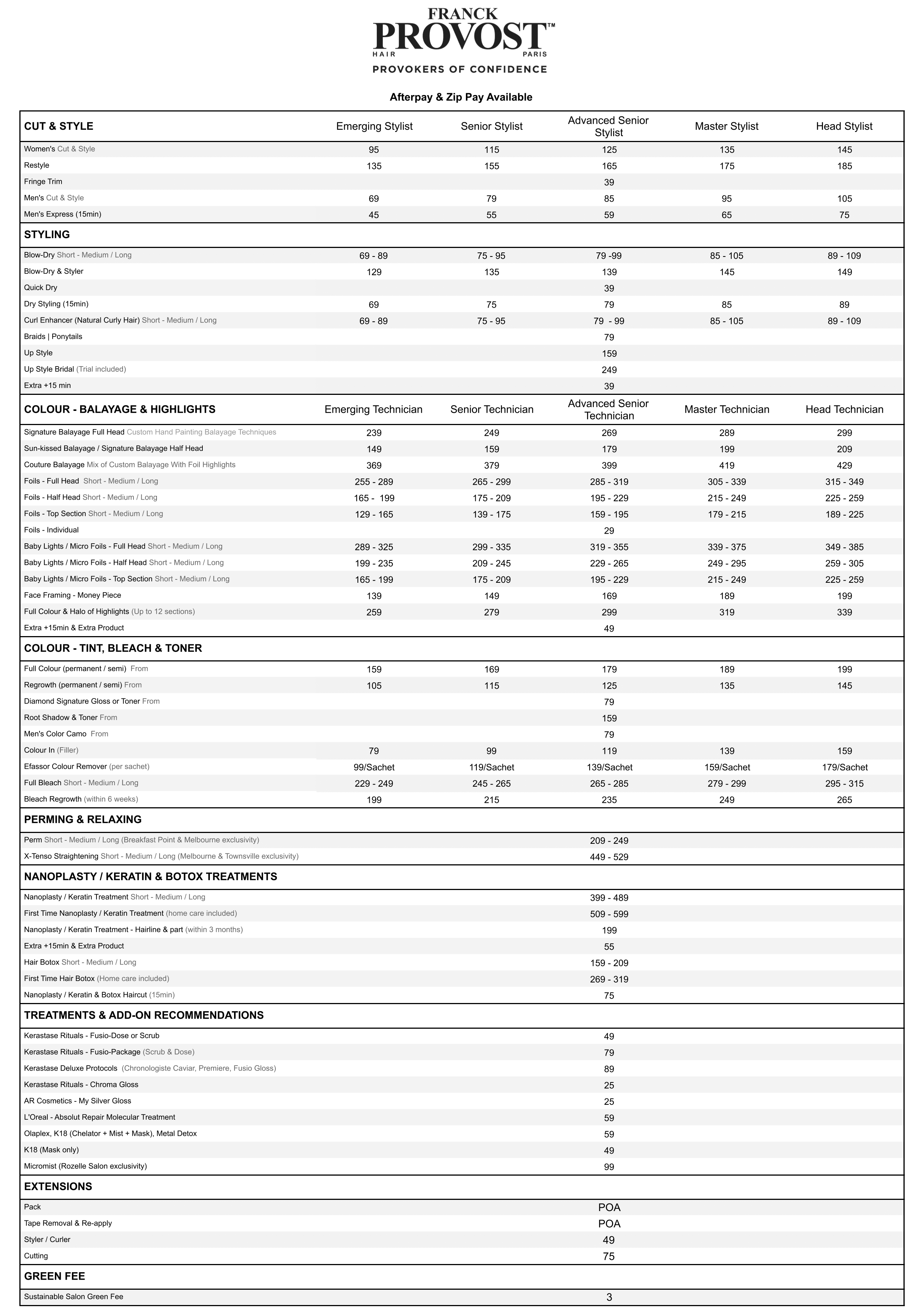 Franck Provost Menu of Services and Prices in Townsville hair salon